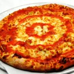 American Madness Round thin crust, our Sicilian plum sauce and onions, topped with American shredded cheese